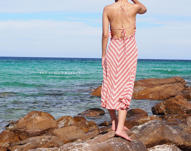 縦と斜めのストライプ使いが新鮮なミディアム-ロング丈のドレス。